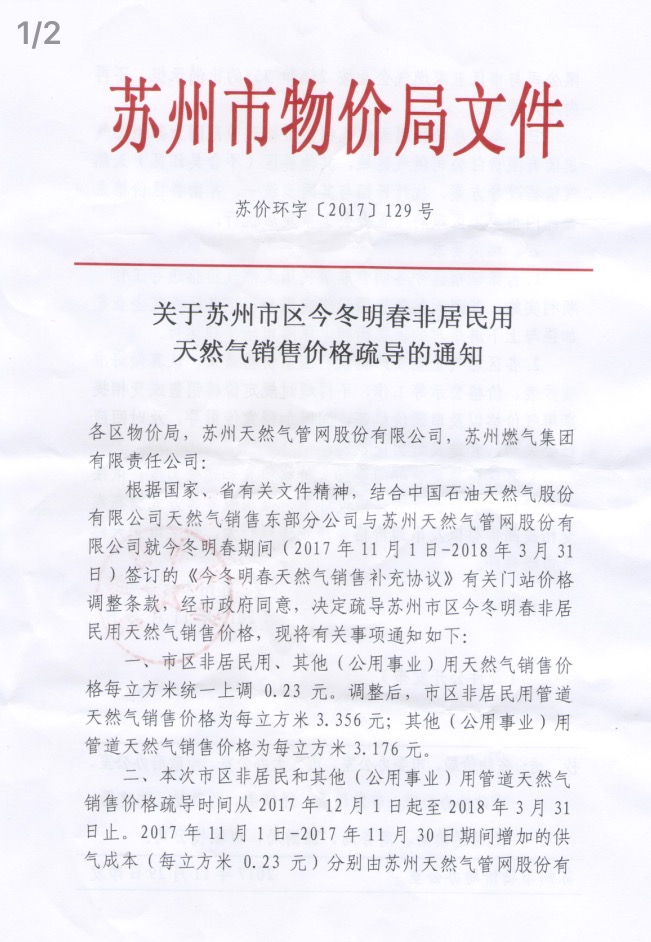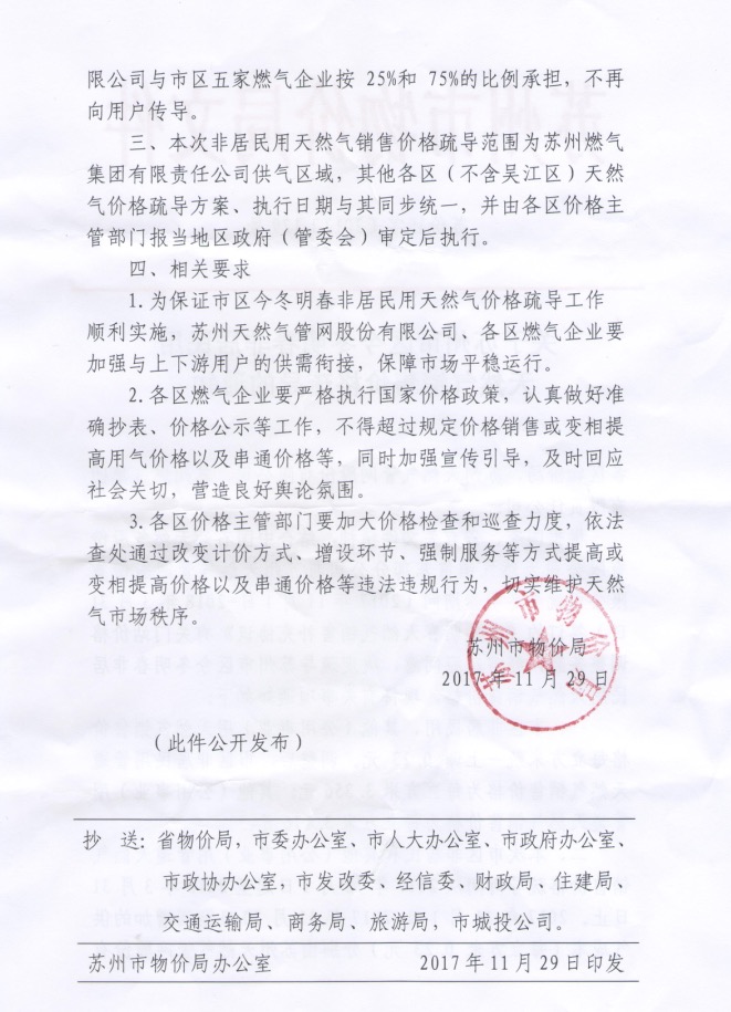关于苏州市区今冬明春非居民用天然气销售价格疏导的通知