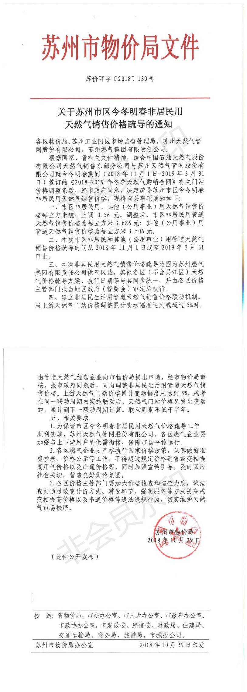 关于苏州市区今冬明春非居民用天然气销售价格疏导的通知