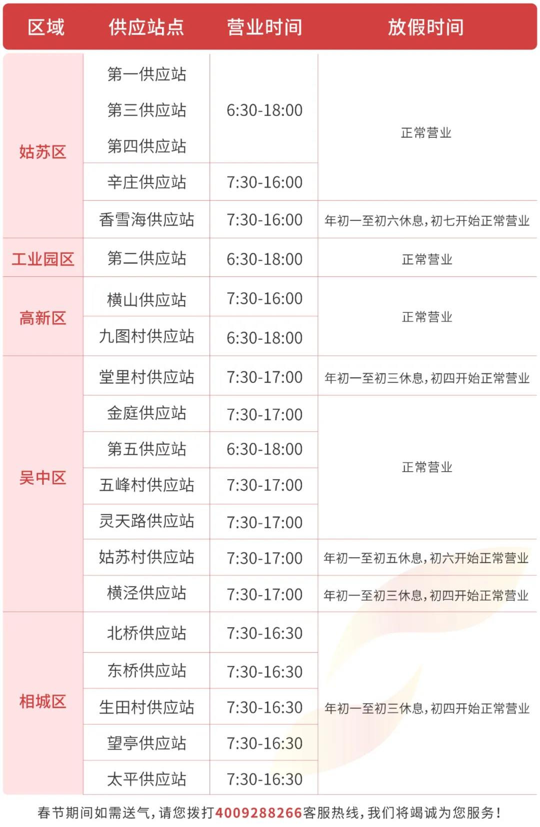 尊敬的苏州燃气瓶装液化气用户,特别提醒您在节假日期间注意用气安全:保持用气场所通风,定期更换软管,用气后及时关闭灶具与钢瓶阀门,做到人离火灭阀关。如您发现问题请立即拨打客服热线4009288266。