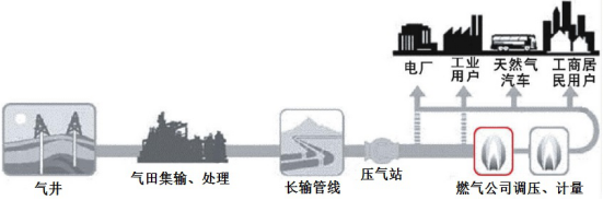 长距离输气管线联系着气田集输系统及城市配气站,用于将处理后的天然气送往城市中的用户,其输送距离较长,且主要由管道及输气站两部分组成,前者包括沿线的截断阀室、阴保站等,而后者主要是通过压缩机对沿线的管输天然气进行加压。长输管线中的天然气由于其压力过大,还无法直接通往用户,因此就需要从城市配气站(或称门站)开始,通过各级的调压、计量将天然气保质保量地输送至城市用户。