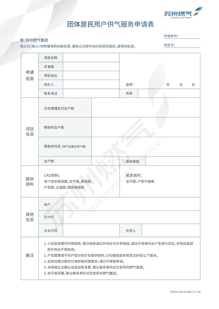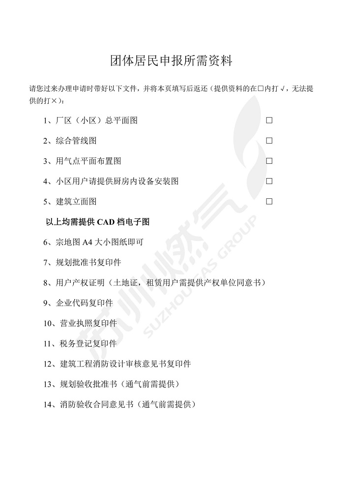 请携带营业执照复印件、小区总平面图、规划批准书复印件、建筑立面图、宗地图、厨房内设备安装图(用气点平面布置图)、综合管线图等至苏州燃气客服中心填写《团体居民用户供气服务申请表》。