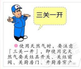 冬季用户临入睡前,燃气安全防范要做到“三关一开”,即:关闭灶具旋钮、关闭灶前阀、关闭厨房门,开启厨房窗户通风。
